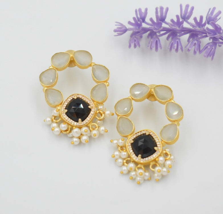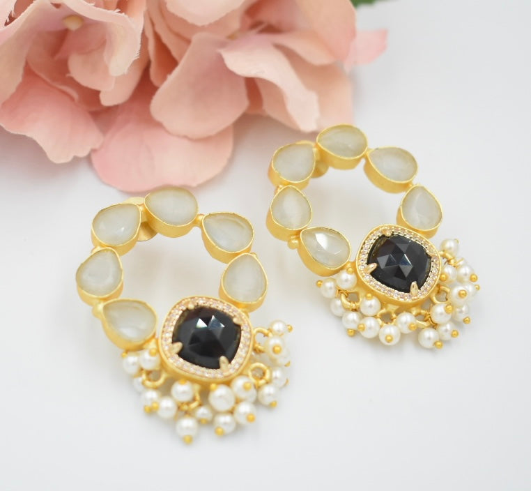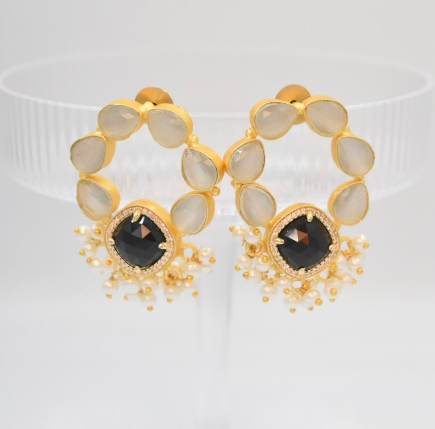 Exude confidence & contemporary glam in our Bombshell statement hoops. Luxuriously handcrafted with selenite, cubic zirconia-framed black onyx and pearls clusters, these this iconic pair will complete your look with sophistication & grace.