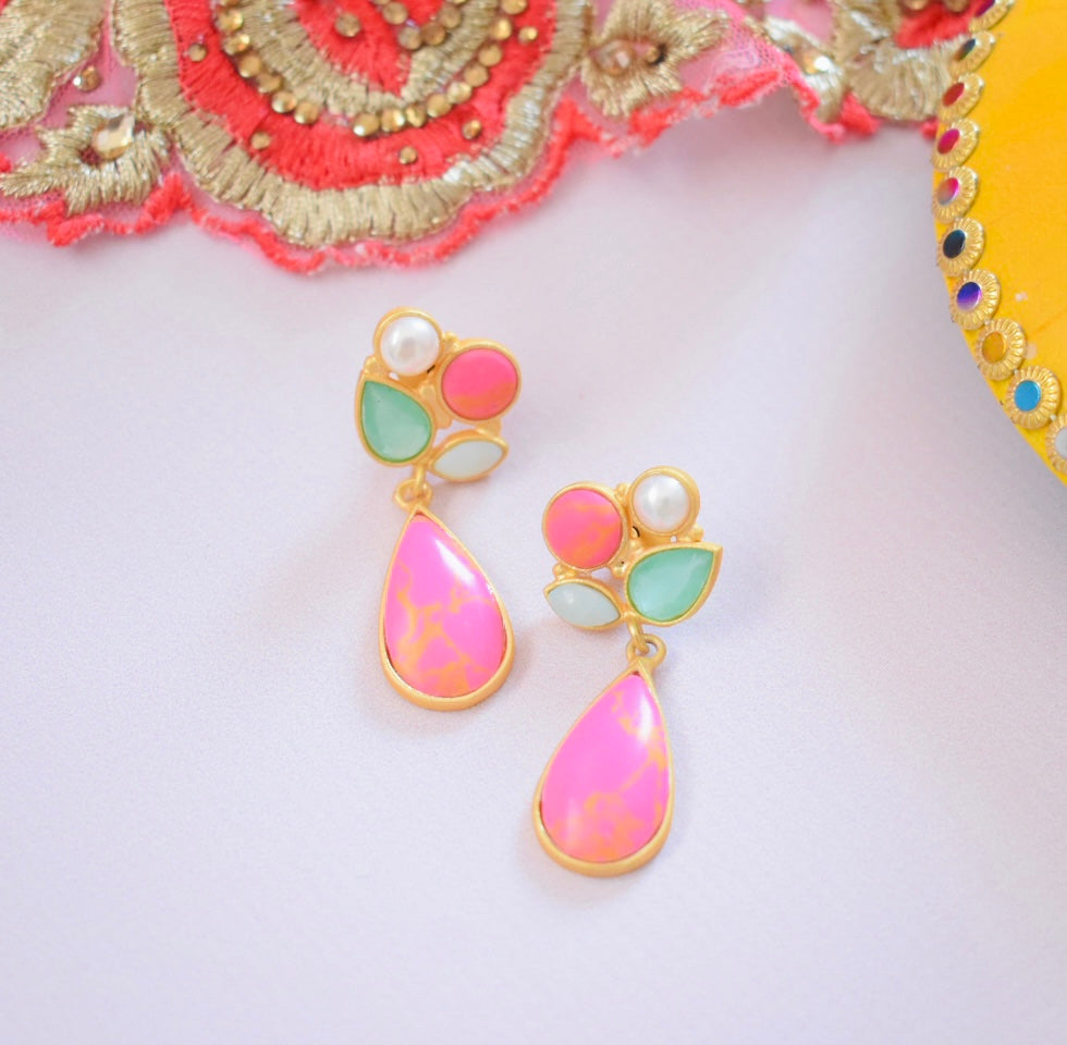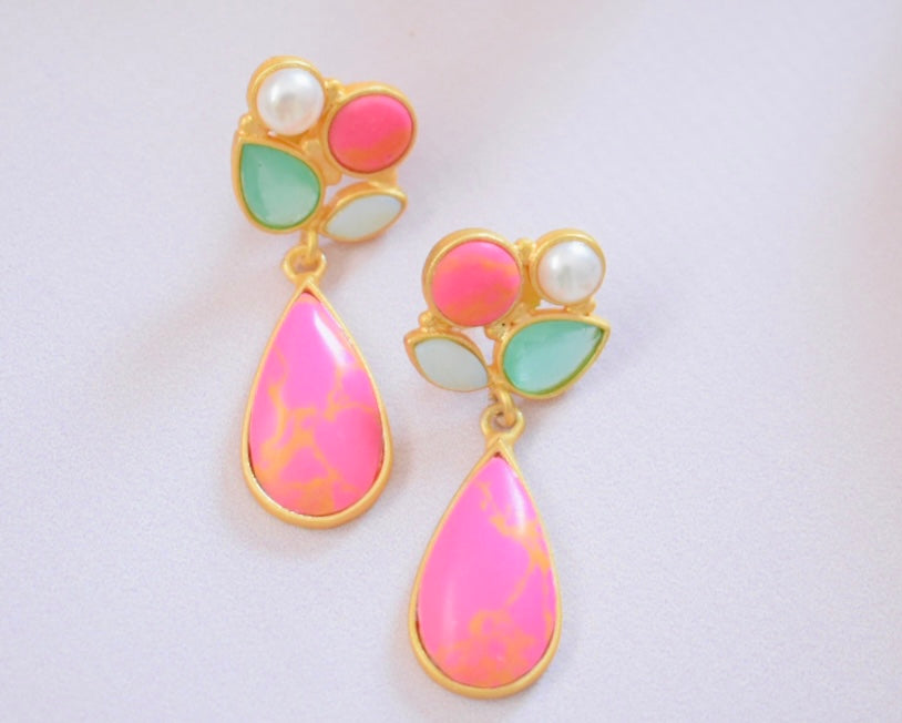 Fuchsia jasper, freshwater pearl, moonstone & green opalite statement drops.