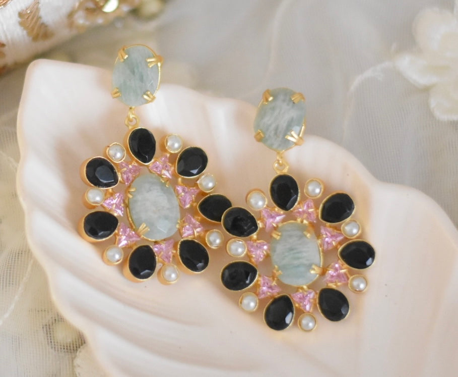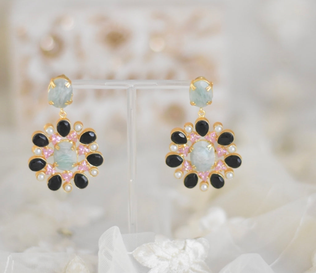 Dress to impress in our Onyx Odyssey statement earrings - a luxurious blend of natural black onyx, amazonite, freshwater pearls and Swarovski Crystals handcrafted in an intricate flower design.